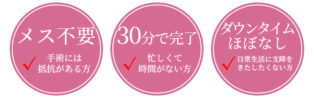 - 術後固定は不要で、腫れ痛みもほとんど無いため周囲に気づかれません。